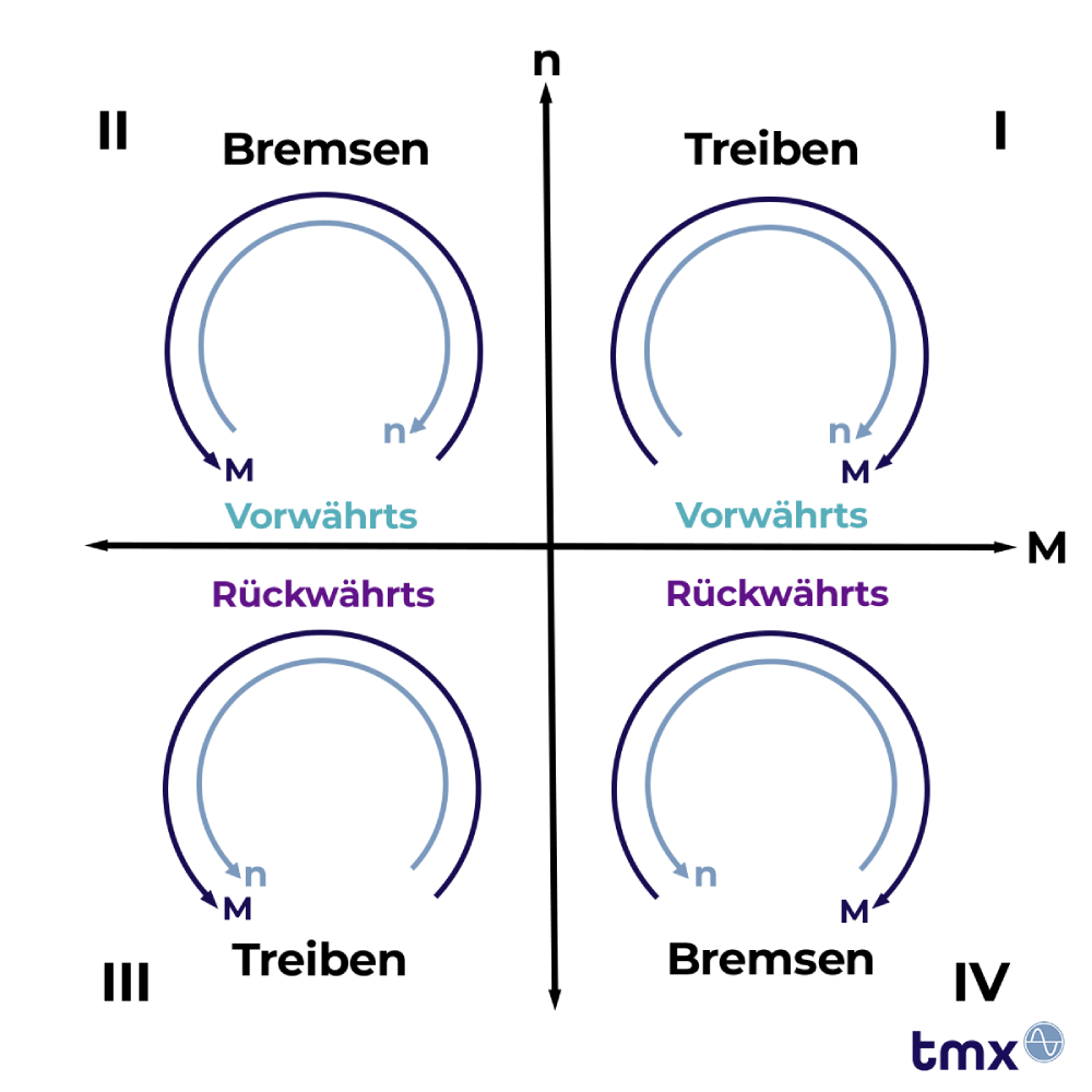 Der Betrieb eines elektrischen Antriebs lässt sich in vier Quadranten unterteilen, die sich aus der Kombination von Drehzahl n und Drehmoment M ergeben: